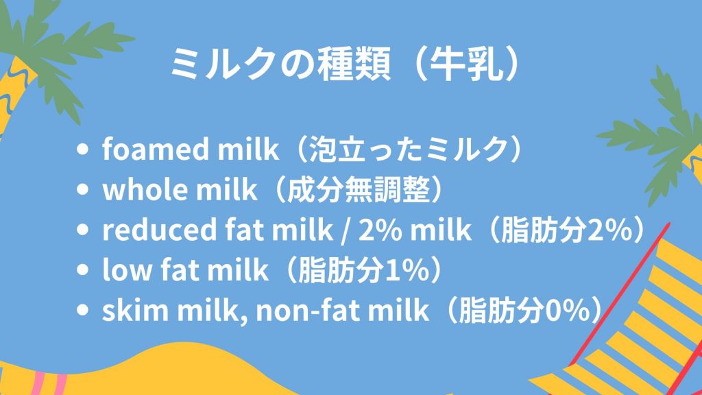→ 「2% milk, please.(2%ミルクでお願いします)」